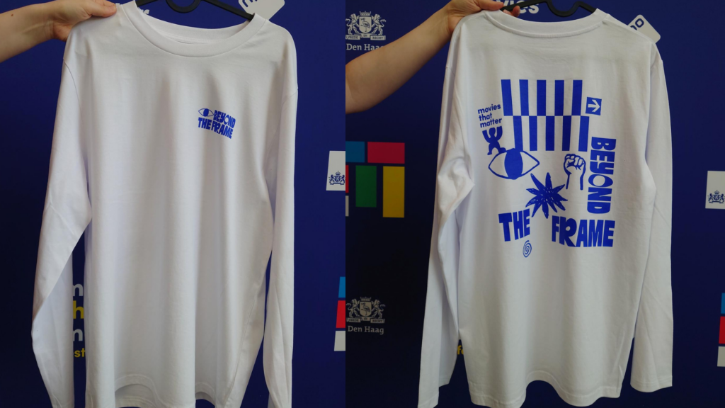 The collection includes screen-printed long sleeves, embroidered caps, and a woven scarf, featuring typography that playfully nods to the festival’s Beyond the Frame theme. Each item is designed with love, care, and craftsmanship, in collaboration with other makers from The Hague.
